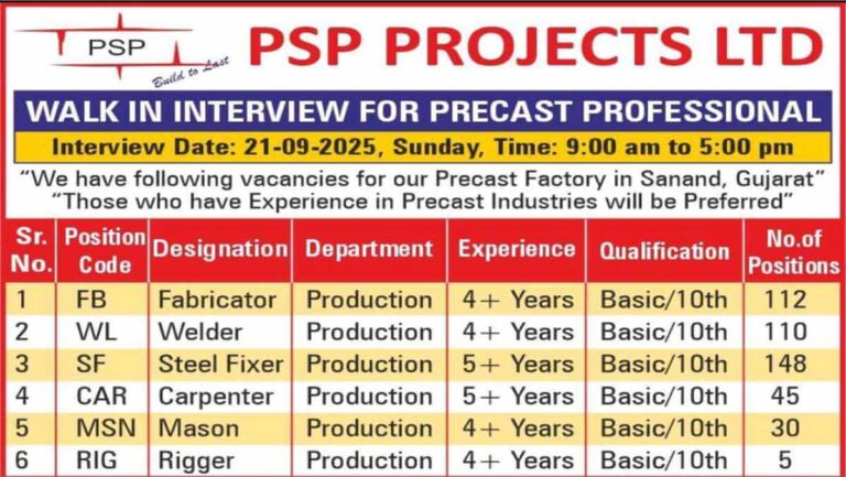 PSP Projects Ltd Walk-In Interview 2025 | 450+ Vacancies | Precast Factory Jobs Company Name …