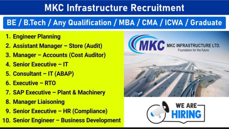 MKC Infrastructure Recruitment | Planning, SAP, HR & Accounts Positions Company Name MKC Infrastructure Ltd …