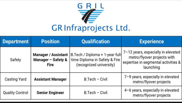 GRIL Hiring 2025 | Nagpur Metro Project Jobs | Apply Now Company Name GR Infraprojects …