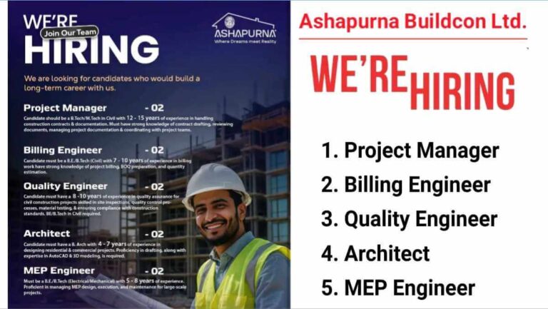 Ashapurna Buildcon Recruitment 2025 | Project Manager, Billing, Quality, Architect & MEP Roles (Jodhpur) Company …