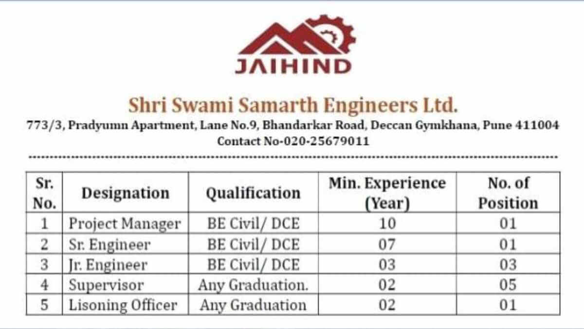 Shri Swami Samarth Engineers Hiring | Irrigation Project Jobs Nashik