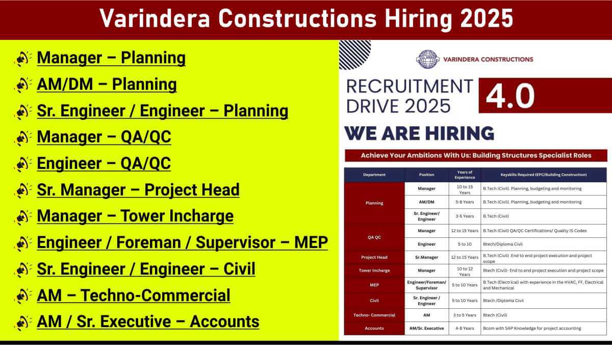 Varindera Constructions Hiring 2025 | Civil, MEP, QA/QC & Accounts Jobs